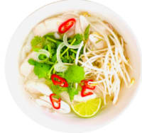 Slowly simmered chicken bone broth, rice noodles, poached chicken breast fillet with beansprouts, coriander, spring onion and lime (on the side) Includes hoisin sauce and siracha sauce. All the meats are Halal Certified.