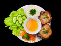 Rice, BBQ Pork Chop, pickled vegetables, cucumber and herbs. Served with Nuoc Mam. (Fish sauce). All the meats are Halal Certified.