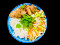Rice, BBQ Chicken, pickled vegetables, cucumber and herbs. Served with Nuoc Mam. (Fish sauce). All the meats are Halal Certified.