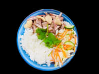 Rice, Roast Pork and Crackling, pickled vegetables, cucumber and herbs. Served with Nuoc Mam. (Fish sauce). All the meats are Halal Certified.