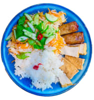 Rice, Lemongrass Beef, pickled vegetables, cucumber and herbs. Served with Nuoc Mam. (Fish sauce). All the meats are Halal Certified.