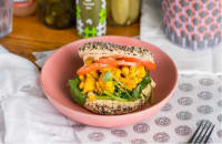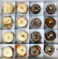 • 4 x Turmeric roast cauliflower with hummus, lemon-dressed watercress & tomato on a seedy-grain bagel • 4 x Luv-U-Lox bagel with smoked salmon, creamy cream cheese, pickled red onion, cress, lemon on rye • 4 x Free-range smoked chicken, tarragon mayonnaise, capers & pickled carrots on a sesame bagel • 4 x Blueberry bagel with peanut butter & raspberry jelly