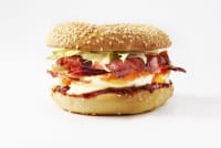 Bacon & egg, kewpie mayo, melted cheese, lettuce, tonkatsu sauce on sesame