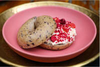 Apple strudel, creamy cream cheese, buckwheat crumb on blueberry bagel
