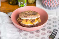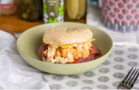 Slow cooked pork scotch fillet, harissa slaw, kewpie, caramelised onion and melted cheese on sesame