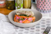 Smoked salmon, creamy cream cheese, pickled red onion, tomato, capers, fresh dill & lemon on rye