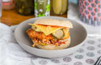 Crumbed free-range chicken breast, truffle cheese, kewpie, harissa slaw, McClure's pickle, fiery chilli sauce on sesame