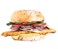 Schnitzel, Tasty Cheese, Baby Cos Lettuce, Tomato, Sautéed Onions, Dill Pickles, Tomato Sauce & Honey Mustard Mayonnaise.
