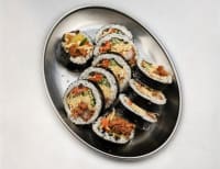 Rice rolls wrapped with seaweed, stuffed with Korean fried chicken, egg, fresh cucumber, cooked carrots, pickled radish and pickled burdock. (Halal, Contains: sesame, seafood, and egg)