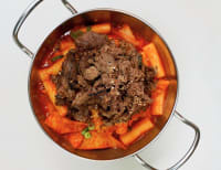 Topokki with chilli peppery sauce with Beef Bulgogi rice cakes, fishcakes and vegetables. (Halal, Contains: sesame, seafood, and egg)