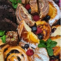 Freshly baked muffins, banana bread, mini tarts, danishes, donuts, almond croissants and plenty more sweetness.
