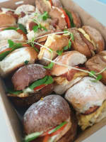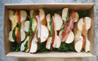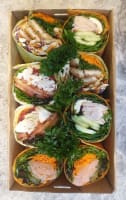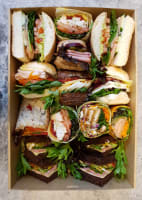 Your box will contain a mix of Turkish, triangle points, wraps, sliders, & rolls. Flavour includes: ● Schnitzel w/ coleslaw, tomato, cheese & lemon pepper mayo. ● Poached Chicken w/ spinach, tomato, avocado, cheese & pesto mayo. ● Smoked Salmon w/ rocket, avocado, tomato, capers & dill cream cheese. ● Veggie (v) w/ falafel, spinach, eggplant, grilled capsicum, feta & hummus. ● Pastrami w/ Swiss cheese, tomato, coleslaw, mustard & spiced pickles. ● Ham Double smoked ham w/ lettuce, tomato, cheese, avocado & aioli. ● Turkey w/ rocket, bocconcini, tomato, cucumber & cranberry sauce. ● Salad (v) w/ avocado, lettuce, tomato, carrot, cucumber, beetroot, cheese & mayo. ● Vegan (vegan) Spinach wrap w/ sauteed kale, rocket, grilled veggies & vegan cream cheese. 20% veg provided as standard, sliders = 1 serve.