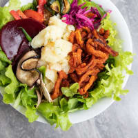 Hummus, potato salad, caramelised carrots, mushroom, lentils, cucumber, capsicum, green beans, red cabbage, grilled eggplant, grilled zucchini, beetroot, lettuce and rocket