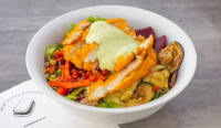 Chicken schnitzel, potato, carrots, lentils, capsicum, cucumber,mushroom,grilled eggplant, grilled zucchini, beetroot , lettuce, rocket, double herb mayo and chilli sauce