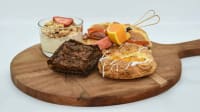Individually packaged. Each box contains: ● Your choice of savoury filled croissant (1 PP) ● Assorted slice (1) ● Yogurt fruit (1) ● Pastry (1) ● Fruit skewer
