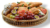 Individually packaged. Each box contains: ● Assorted mini croissant (1pp) ● Assorted cocktail quiches (1pp) ● Mini muffins (1pp) ● Mini sweet danishes (1/2 pp) ● Seasonal fruit