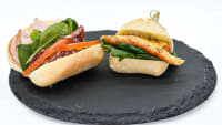Served on platters to share. This package includes: ● Bacon and egg rolls (6) ● Bacon and egg lepinja (2) ● Baguettes with chicken schnitzel, bacon and cheese (2) ● Chicken wings (8) ● Tomato and BBQ sachets
