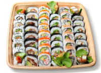 73 pieces of mini rolls featuring our prawn tempura and cucumber mini roll, cucumber baby roll, fresh salmon and avocado mini roll, avocado baby roll, california mini roll, chicken katsu and cucumber mini roll, fresh salmon baby roll and cooked tuna and avocado mini roll. This is the perfect platter to make sure everyone gets a bite during a big party.