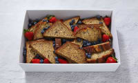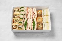 ● 3 x cucumber & dill cream cheese finger sandwiches ● 3 x egg finger sandwiches ● 3 x petite smoked salmon & cream cheese bagels ● 4 x chicken schnitzel brioche rolls ● 3 x chicken wraps ● 3 x falafel wraps ● 2 x ham, sun dried tomato & cheese focaccia ● 2 x chicken schnitzel & slaw focaccia