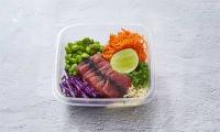 Sashimi tuna, brown rice & quinoa, wakame, edamame beans, shredded cabbage, carrot with lime & coriander dressing.