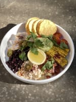 Chickpea falafel, hummus, quinoa, pickled turnip, shredded carrot, avocado, cucumber, cherry tomato, kale, pickled chillies, parsley, toasted pumpkin seeds, balsamic vinegar glaze, extra virgin olive oil (ve)