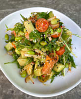 Salmon sashimi, mizuna, edamame, cucumber, radish, tomato, avocado, toasted sesame seeds, shichimi togarashi, Dooubanjiang (gf, df)