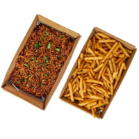 Yia Yia’s chips loaded with chargrilled chicken or lamb, feta, mustard mayo, tzatziki, Bukovo flakes and fresh herbs.