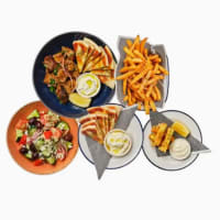 Chargrilled chicken, Greek salad, YiaYia’s chips, halloumi chips, tzatziki dip, pita bread.